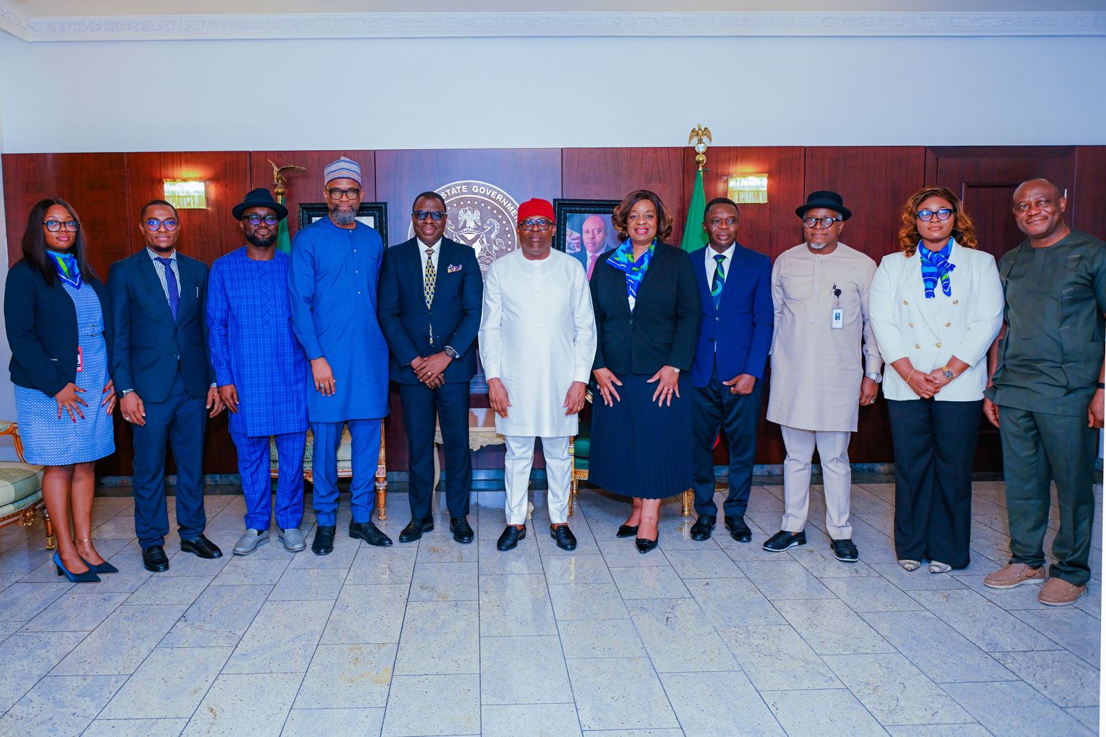 L to R: Miss Homa Nmegbu, Govt. Relations Advisor; Abdul Saleh, Technical Adviser to Exexutive Management; Dr Yemi Adeyemi, Manager Community Relations; Abdul Umar, Manager, Government Relations; Engr Adeleye Falade, MD/CEO, Governor of Rivers State, His Excellency, Siminalayi Fubara; Dr Sophia Horsfall, GM, External Relations & Sustainable Development; Mike Igoni, Head, Govt Relations; Ifeanyi Umeh, Head Community Engagement & Liaison, Kate Allison, Senior Govt Relations Advisor and Emma Nwatu, Senior Media Advisor, in a group photograph during the courtesy visit on Wednesday.